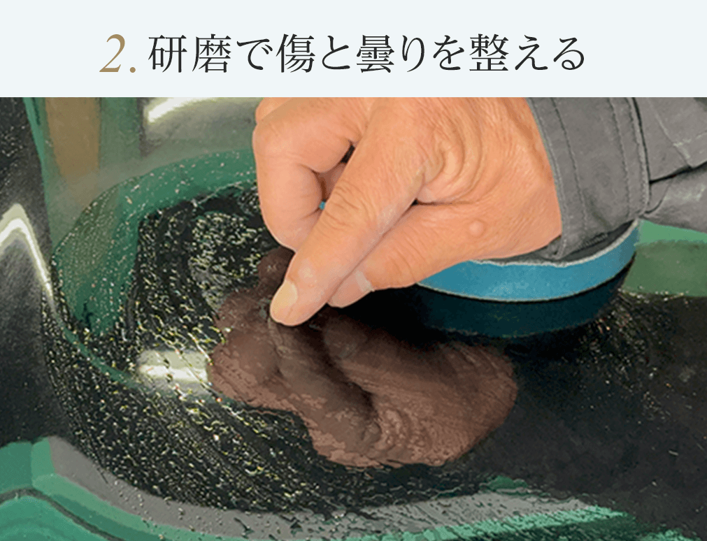 塗料が残っていない深い損傷は復元できません。それ以外は、塗装を剥がさない限界を見極めて整えます。